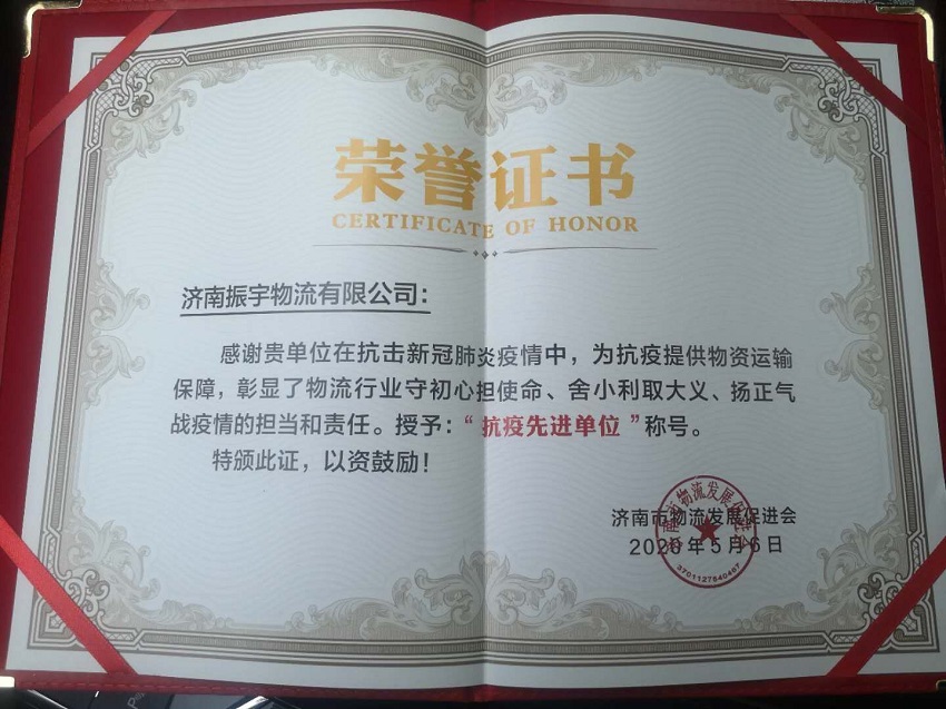 經評選,振宇物流榮獲“抗疫先進單位”,總經理張憲振榮獲“抗疫愛心個人”!