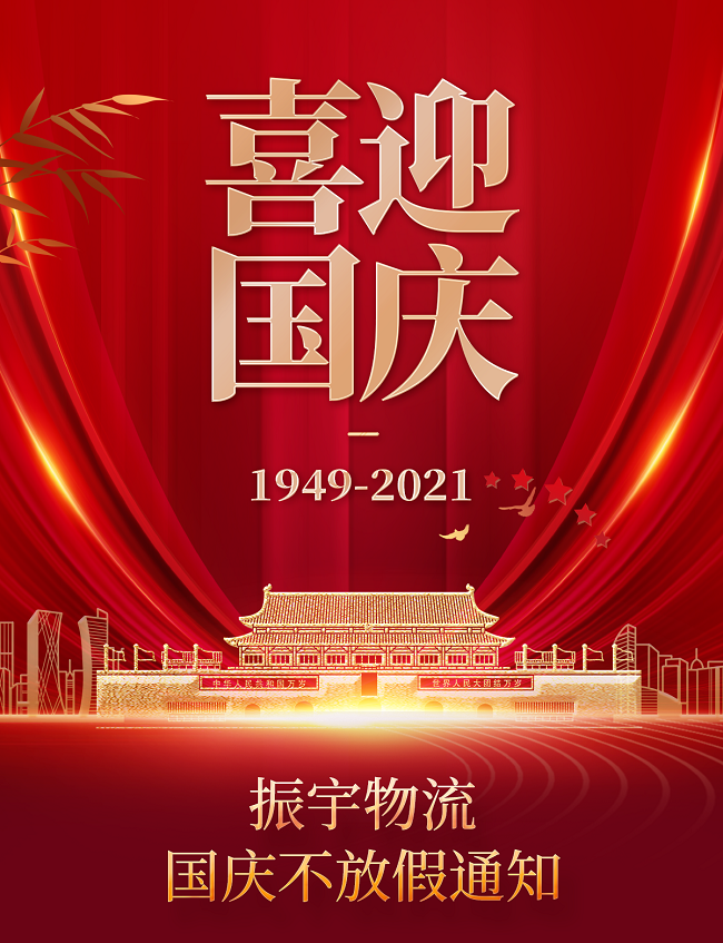 您好!正值秋高氣爽天,恰逢稻熟豐登日,祖國母親即將迎來72周年華誕。五星紅旗迎風(fēng)飄揚(yáng),我們同慶祖國華誕的榮光!振宇物流為了給您提供更好的服務(wù),并結(jié)合我司實際情況,現(xiàn)對國慶假日期間做出如下工作安排: