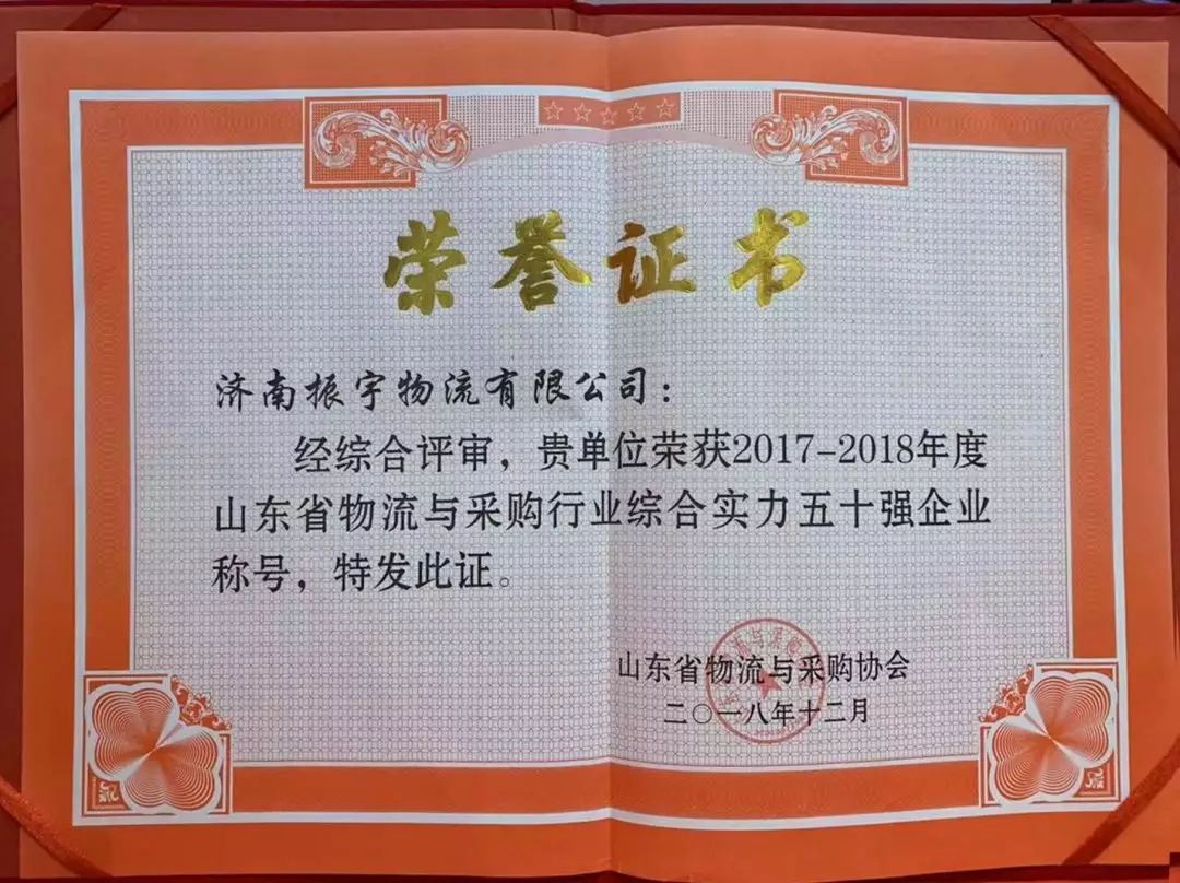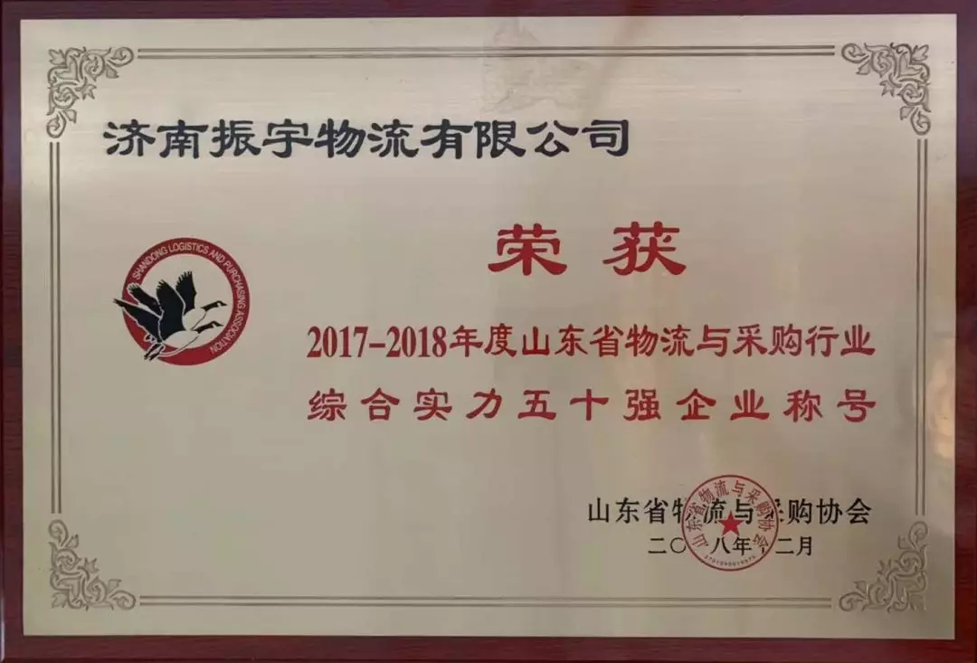 振宇物流經山東省物流與采購協會綜合評審,榮獲2017-2018年度山東省物流與采購行業綜合實力五十強企業稱號。