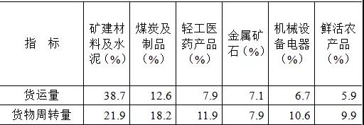 貨運量的主要貨類構(gòu)成中,“礦建材料及水泥”占比最高,為38.7%;其次是“煤炭及制品”,占比12.6%;“輕工醫(yī)藥產(chǎn)品”“金屬礦石”“機械設(shè)備電器”“鮮活農(nóng)產(chǎn)品”等貨類次之,占比分別為7.9%、7.1%、6.7%和5.9%。