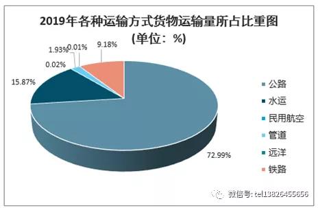 2019年各種運輸方式貨物運輸量所占比重圖(單位:%)