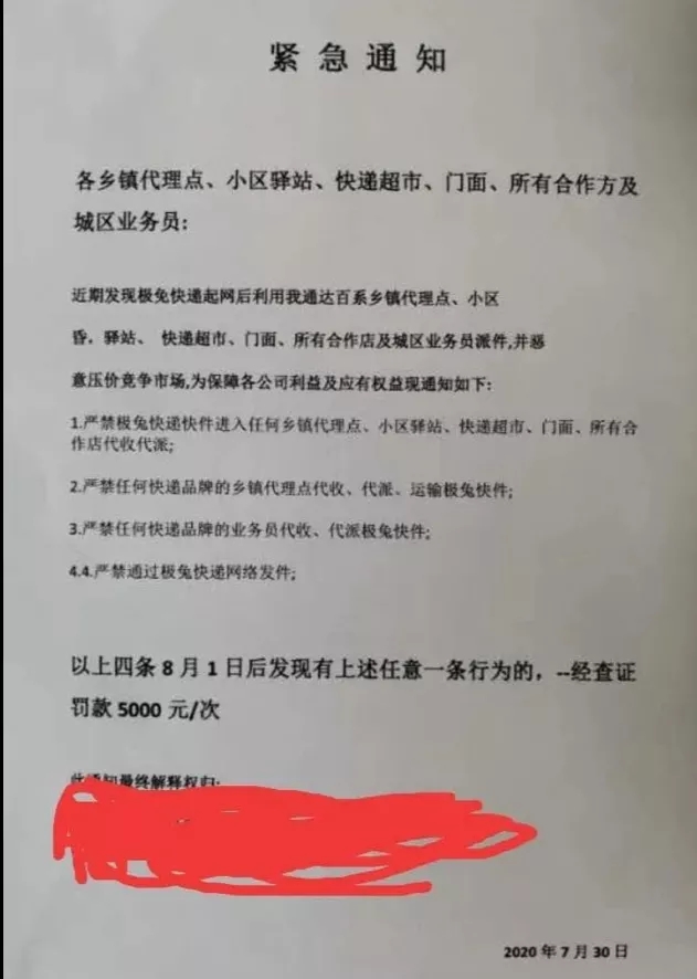 7月底,有某通達系快遞總部下發通知,要求全網各網點禁止代理極兔速遞業務,通知指出,攬派兩端加盟公司不得以任何理由、任何形式代理極兔速遞業務。還有通知指出,如果通達百系中鄉鎮代理點、小區、驛站、快遞超市等業務員因惡性低價競爭攬收極兔速遞的,經查證,每次予以5000元罰款。