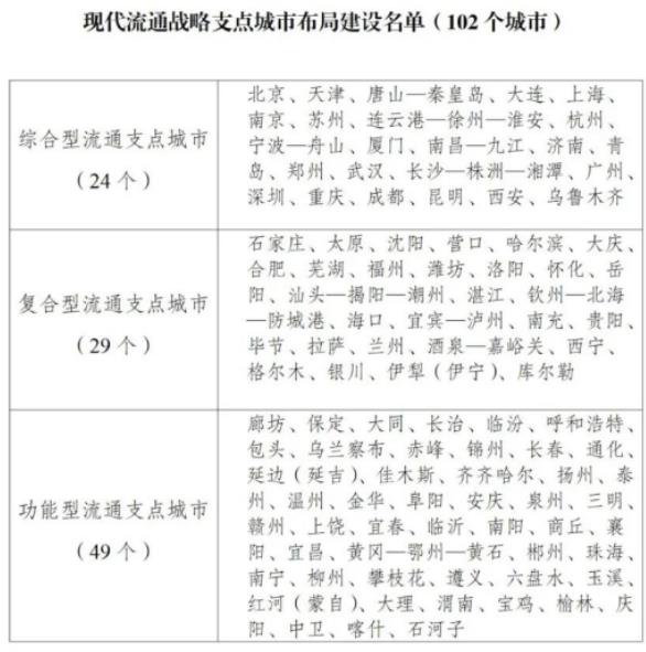 《通知》堅持系統(tǒng)思維和全局觀念,突出國家所需和城市所長,按照服務(wù)重要商品和資源要素流通、強(qiáng)化跨域跨界輻射帶動、促進(jìn)現(xiàn)代流通發(fā)展等三個維度布局流通支點城市。綜合考慮城市資源稟賦、發(fā)展基礎(chǔ)、比較優(yōu)勢、未來潛力,將102個城市納入布局建設(shè)范圍,覆蓋全國31個省區(qū)市以及新疆生產(chǎn)建設(shè)兵團(tuán)。流通支點城市將按綜合型、復(fù)合型、功能型分類推進(jìn)建設(shè),城市人民政府發(fā)揮主體作用部署推進(jìn),努力提升自身發(fā)展水平,增強(qiáng)輻射帶動作用。