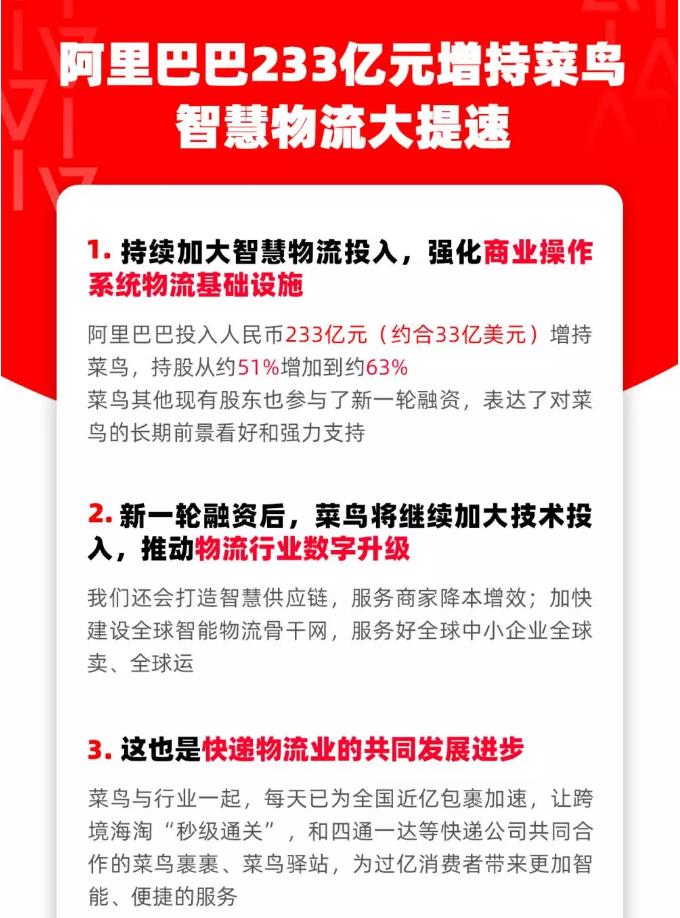 阿里巴巴集團11月8日宣布,為持續加大智慧物流投入,強化商業操作系統物流基礎設施,已領銜完成對菜鳥網絡新一輪增資。阿里巴巴通過增資和購買老股的方式,投入人民幣233億元(約合33億美元),持有菜鳥股權從約51%增加到約63%。菜鳥其他現有股東也參與了新一輪融資,表達了對菜鳥的長期前景看好和強力支持。